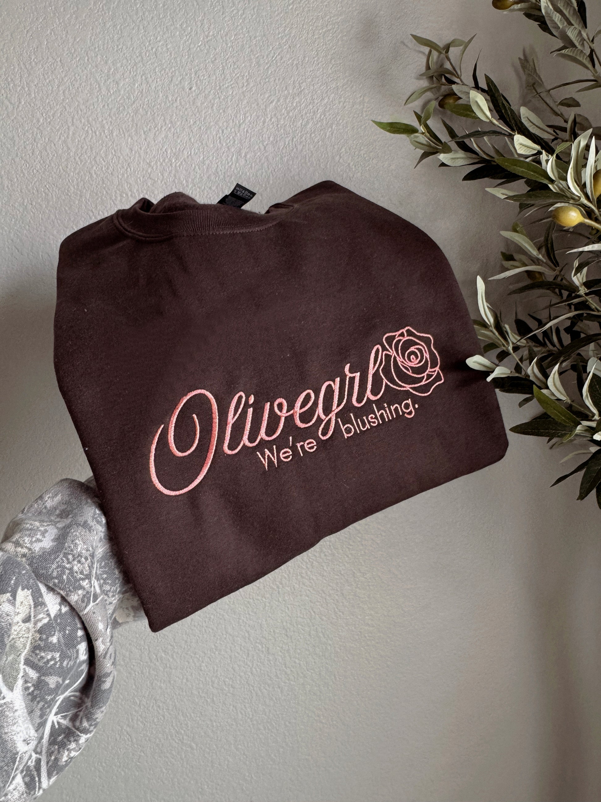 Gildan dark chocolate sweatshirt with a rose pink thread