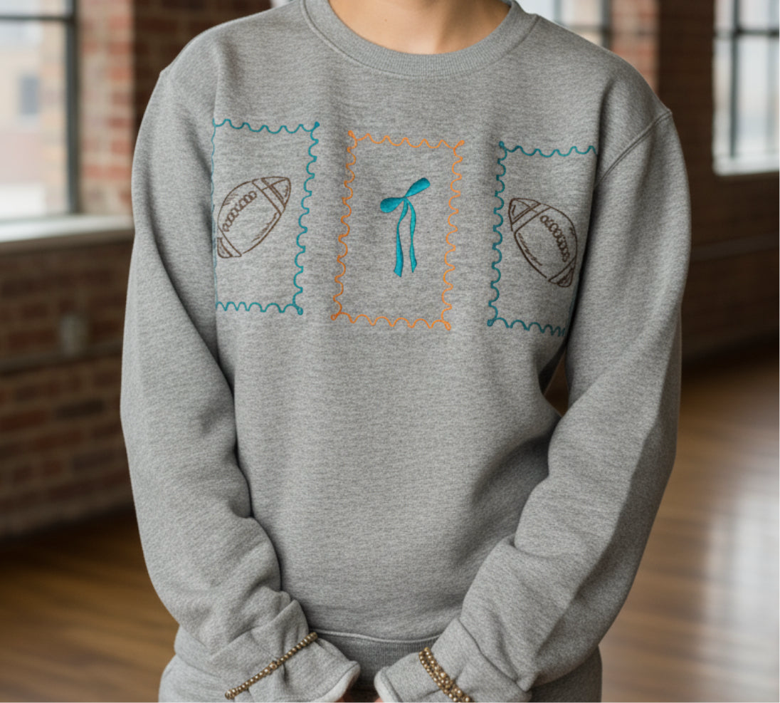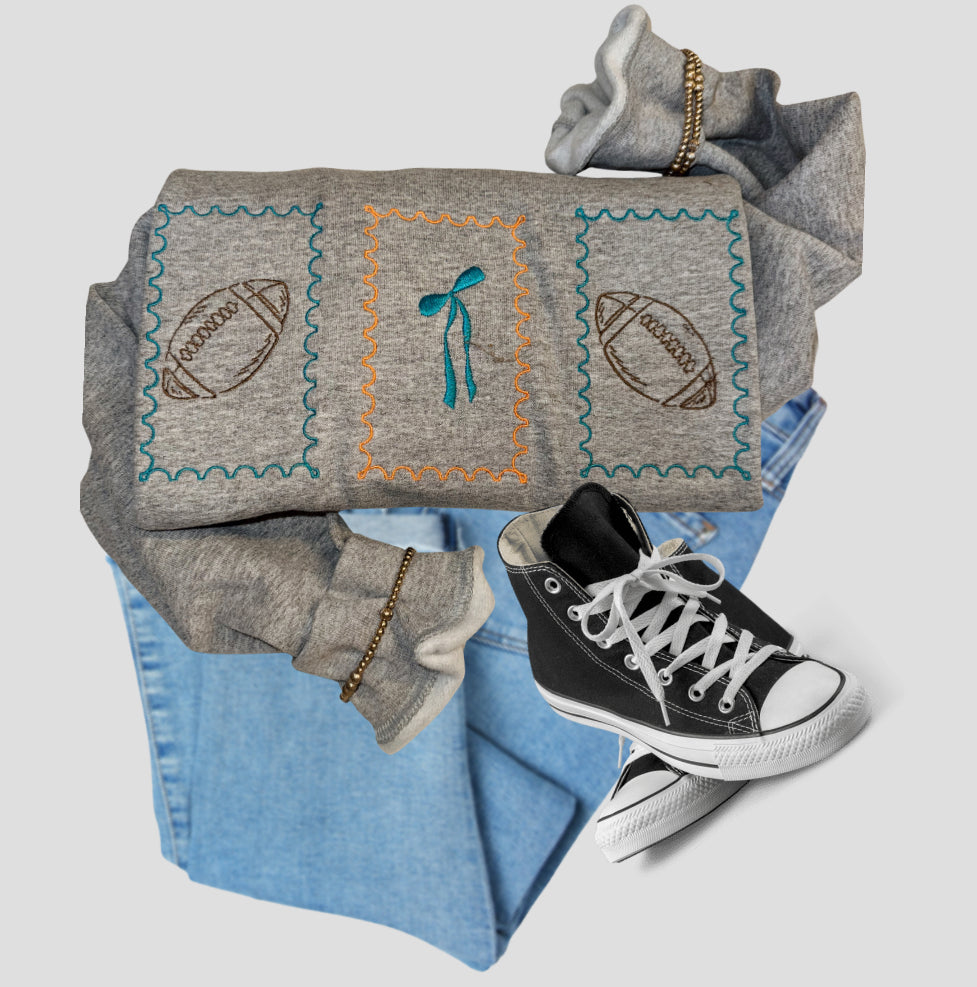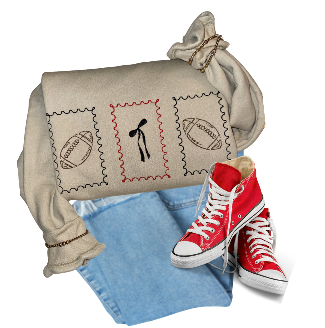 Gildan 50/50 on the color sand. 3 stamped outlines featuring a bow and footballs. Message us for the colors that goes wifth your favorite team.